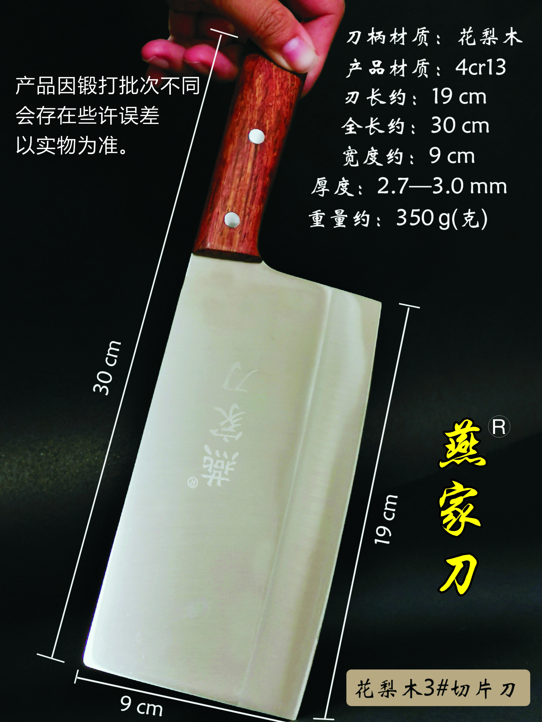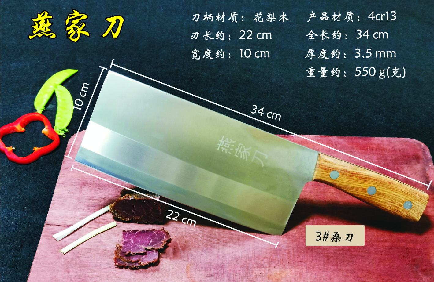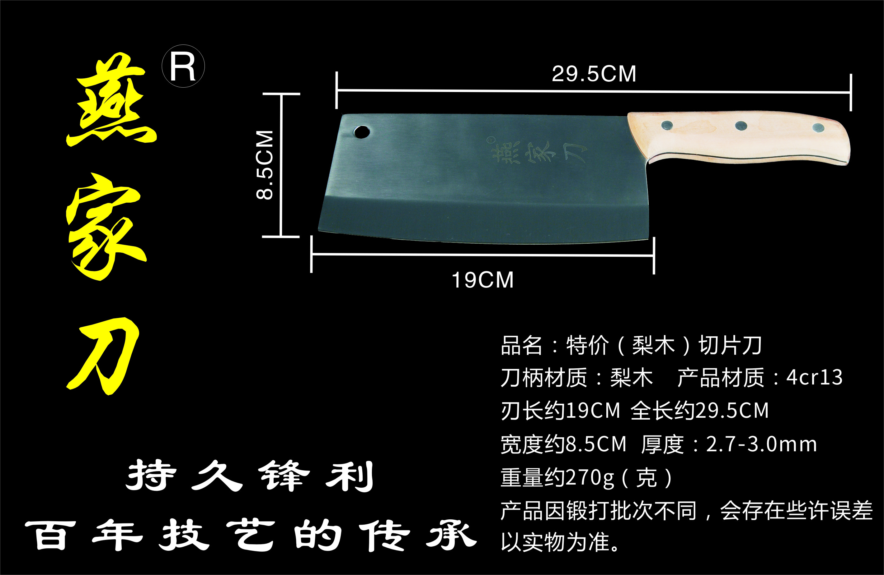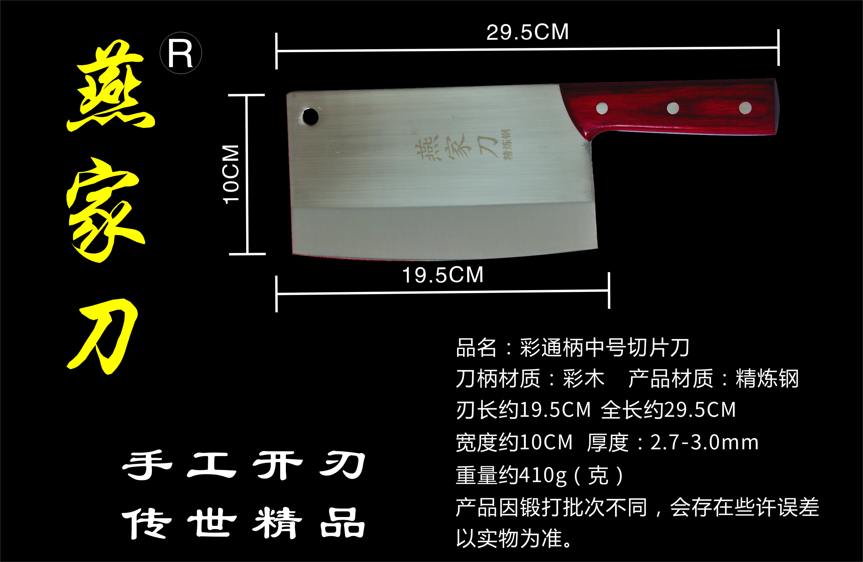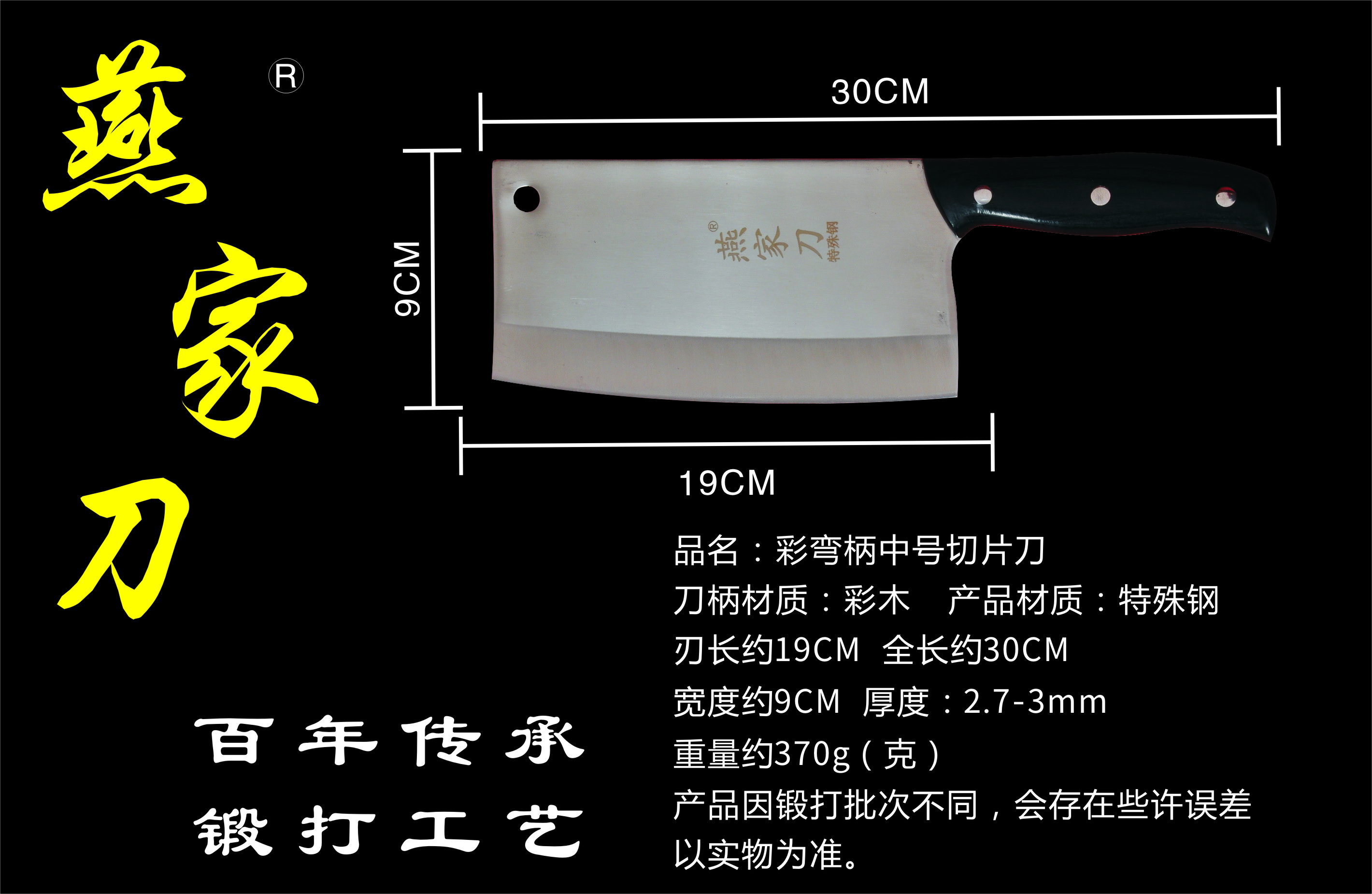 樂山燕家刀具有限公司(公司前身為燕佳鐵匠鋪),公司坐落于美麗的佛都之鄉(xiāng)樂山嘉州,在全國各地有上千家代理經(jīng)銷點,公司專業(yè)銷售、設(shè)計、制作各類刀具。秉承一貫鍛造三精要求,即選料精、用料精、工藝精。所選材料全部產(chǎn)自滇東鐵礦優(yōu)產(chǎn)區(qū)。本品牌刀具堅持千挑萬選為材,千錘百煉為刀的手工鍛造工藝宗旨。具有鋒利耐磨、持久耐用,用料上乘,硬度高、韌度強的特點!